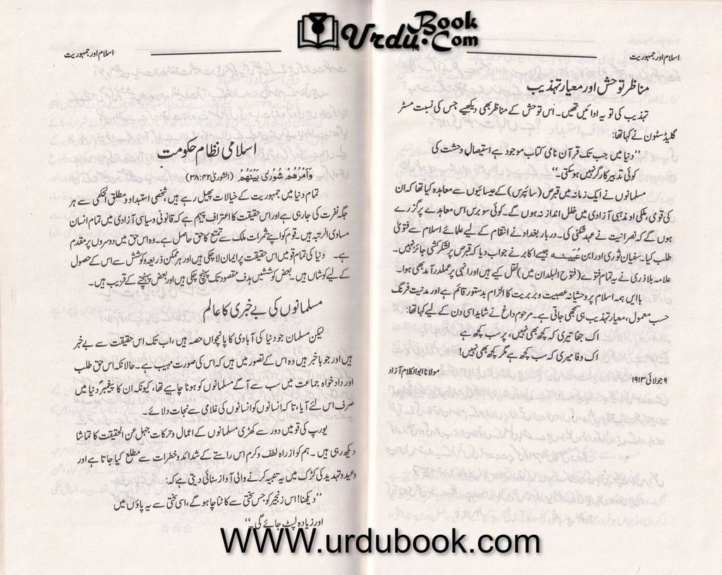 Order your copy of Islam Aur Jamhoriat اسلام اور جمہوريت  from Urdu Book to get discount along with surprise gifts and chance to win  books in Pak book fair.  Author: Maulana Abu Al Kalam Azaad Book Pages: 108  Language: Urdu   Your one-stop Urdu Book store www.urdubook.com